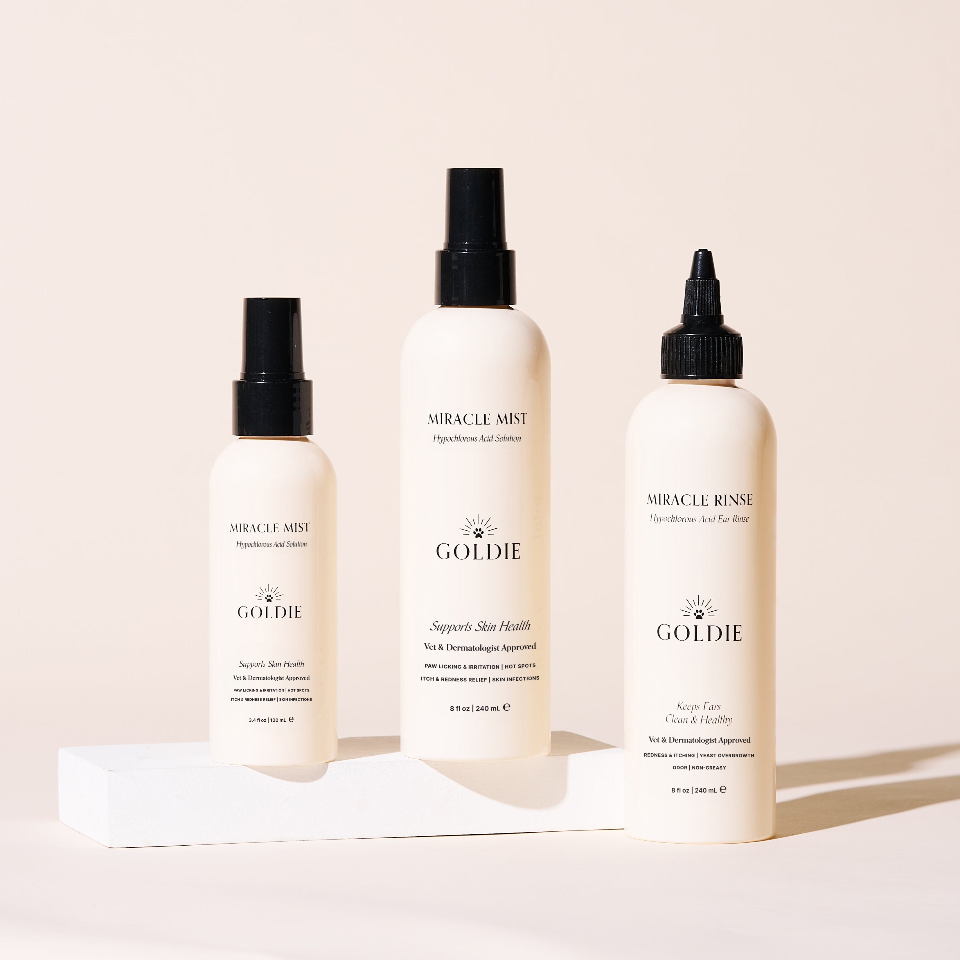 Miracle Mist: A Vet & Dermatologist-approved, gentle hypochlorous acid spray is effective against 99.999% of harmful microorganisms and supports healthy skin.