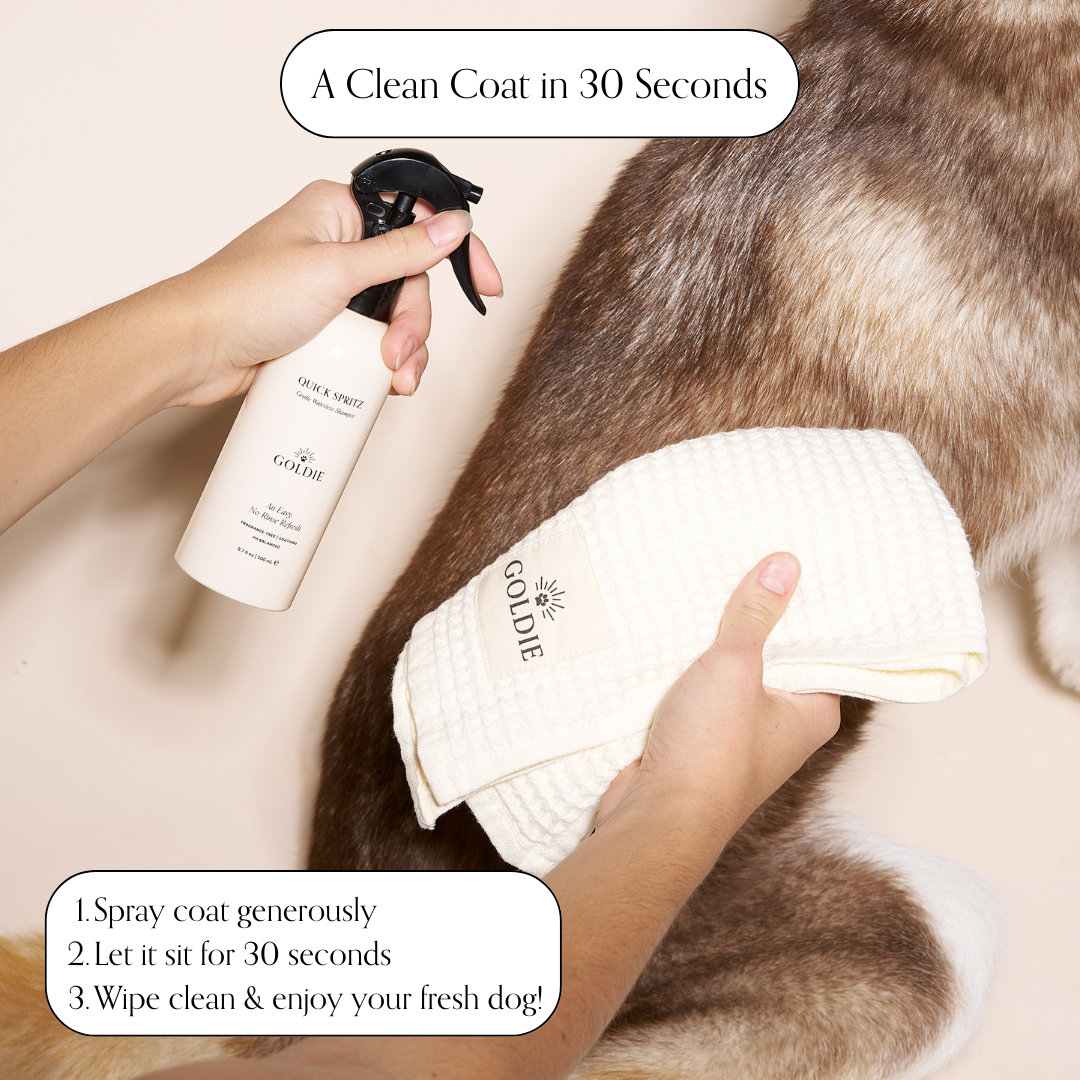 Quick Spritz is a Vet and Dermatologist-approved, no-rinse, waterless shampoo that simplifies your grooming routine. This triple-acting formula cleans, deodorizes and hydrates your dog’s coat in seconds, leaving it soft and fresh. Formulated with micellar water, it gently lifts dirt, oil and impurities without stripping your dog’s natural oils.