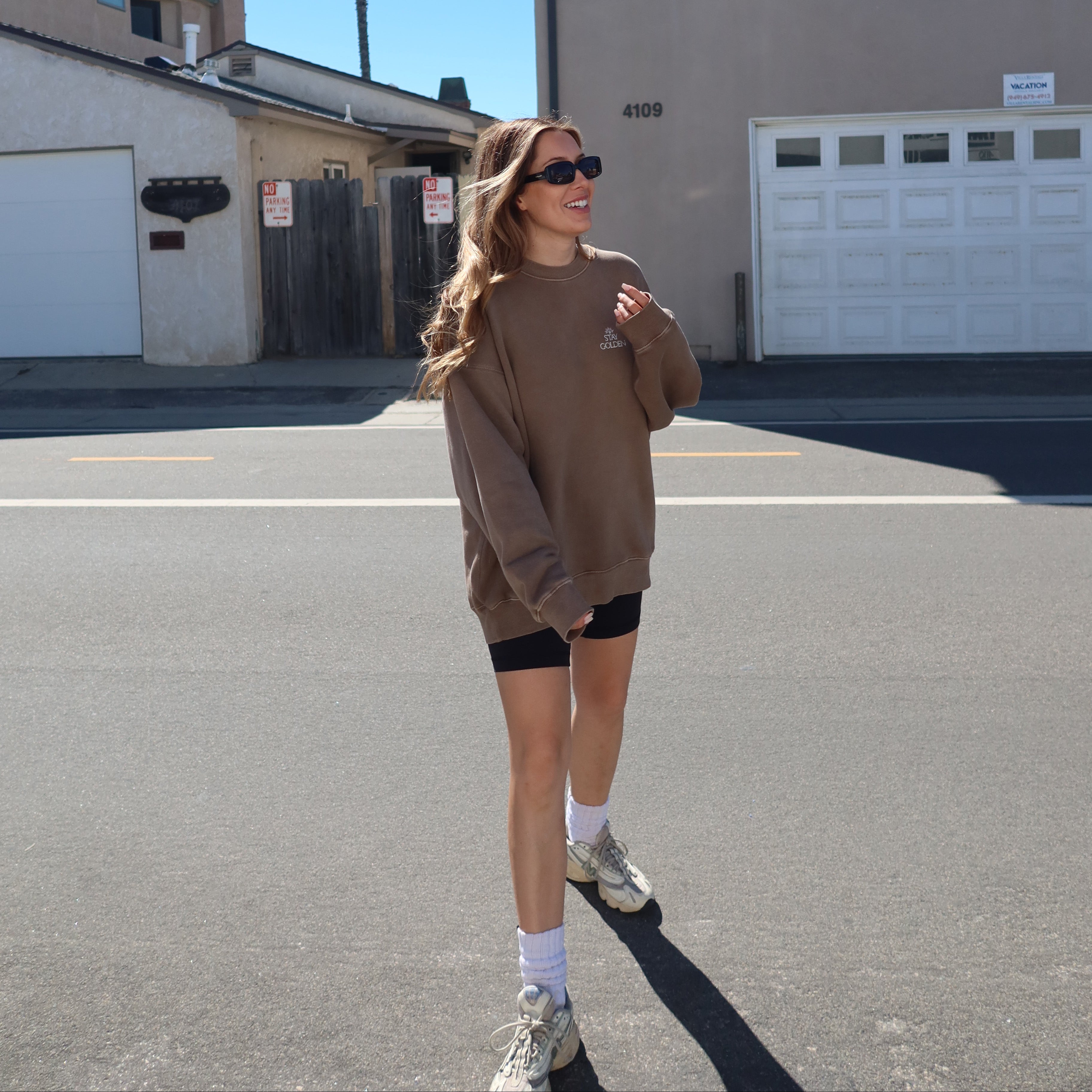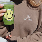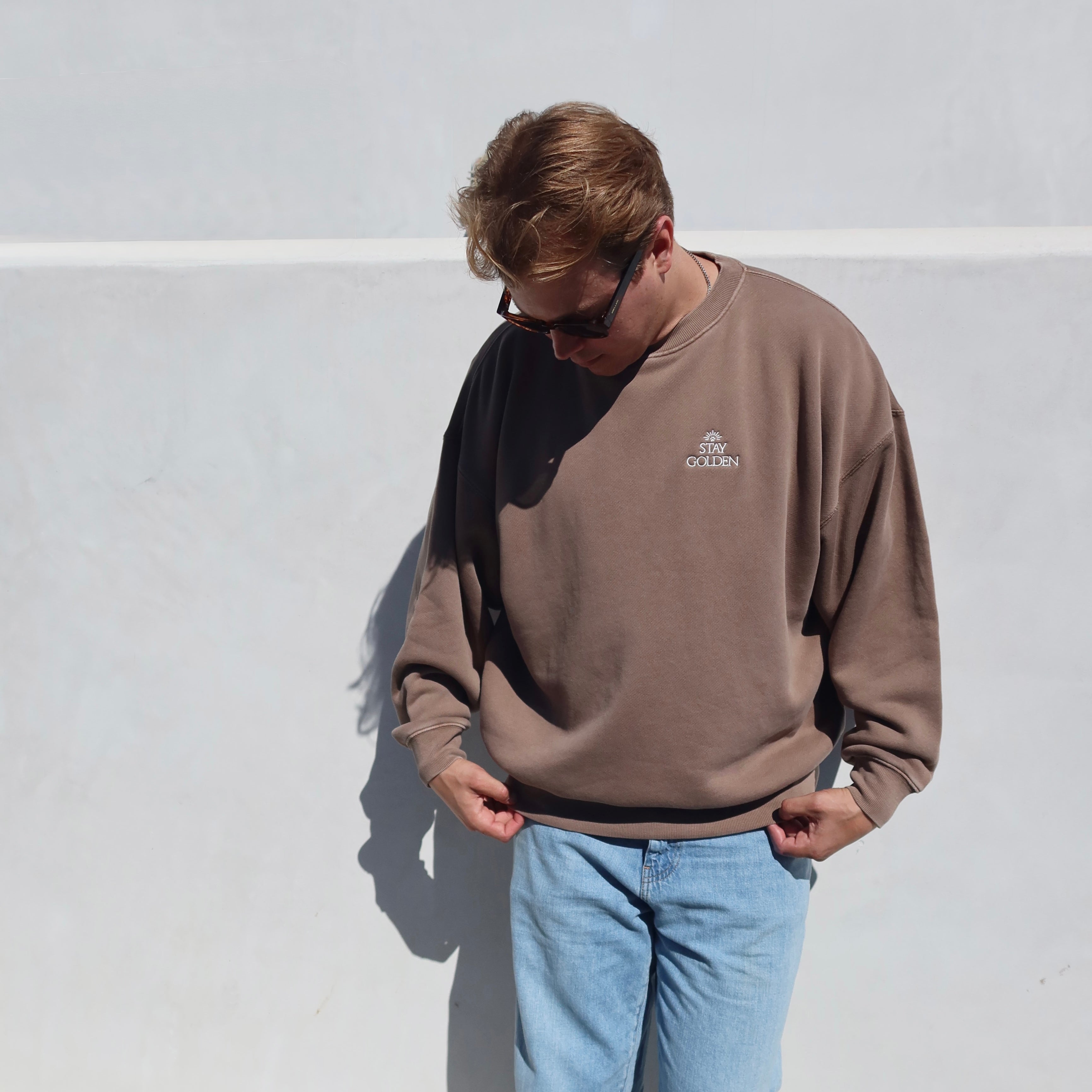 Our Stay Golden oversized crewneck is a lightweight sweatshirt that'll be your new favorite daily staple. It features a vintage brown color with "Stay Golden" and our sunset paw print logo embroidered on the left chest and an embroidered "Goldie" neck tag.
